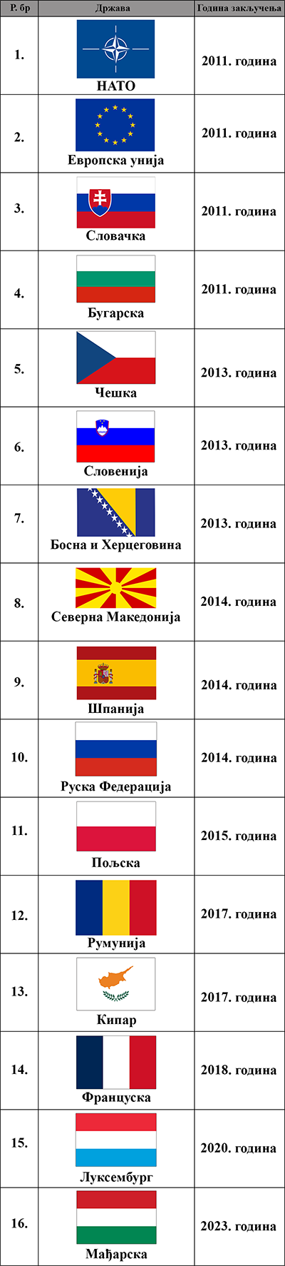 Међународне организације и друге државе са којим је закључен споразум о сарадњи у области размене и заштите тајних података: